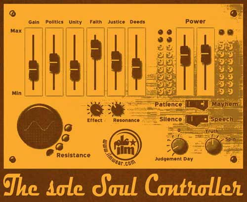 Courtesy -Chocalicious brown tee, based on a DJ cross-fader design. The one and only 'Soul Controller' is an expression of life for all of us in the world today. We've re-labelled all of the dials to represent our emotions, qualities and what's goin' down: